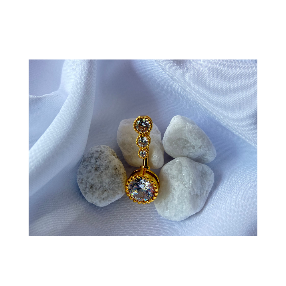 Piercing nombril , orné de 3 boules zircon en haut et d’une boule zircon éclatante en bas. Élégant et résistant pour un style lumineux au quotidien.