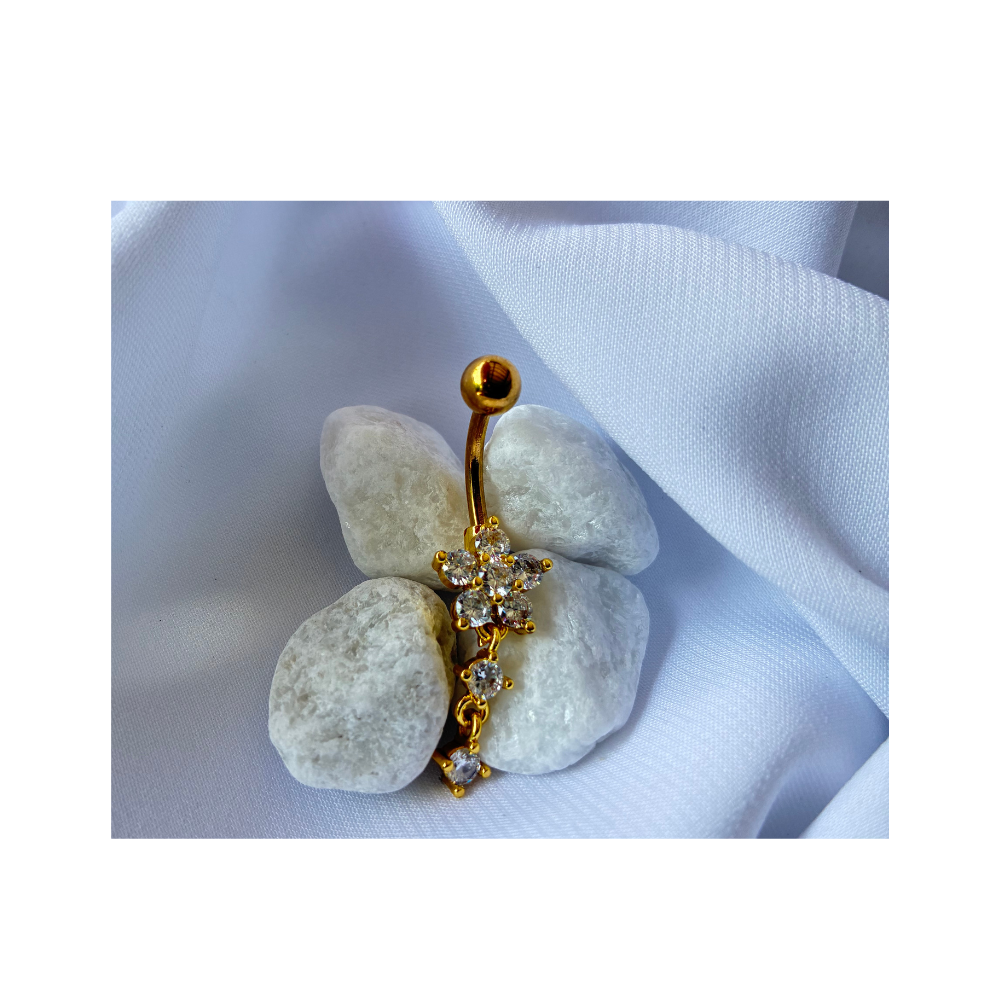Piercing nombril doré au design fleuri, sublimé par des zircons étincelants. Élégant et délicat, il illumine ton style avec raffinement
