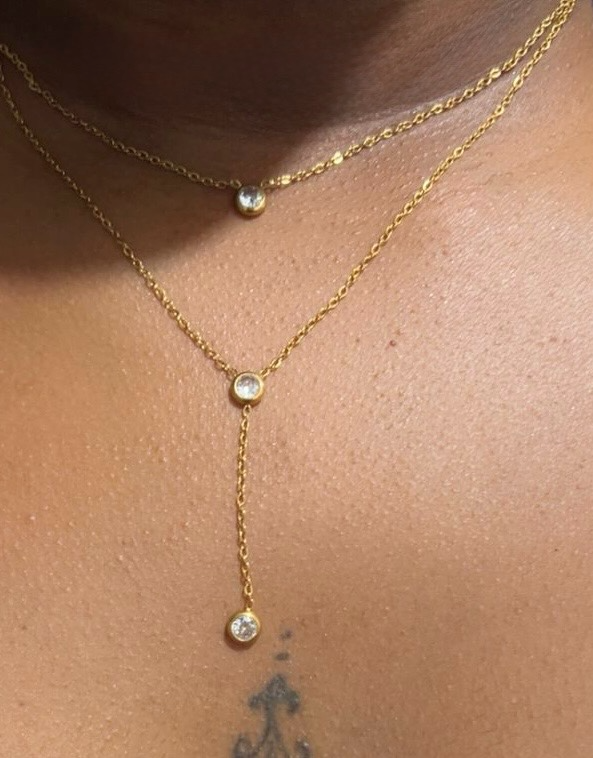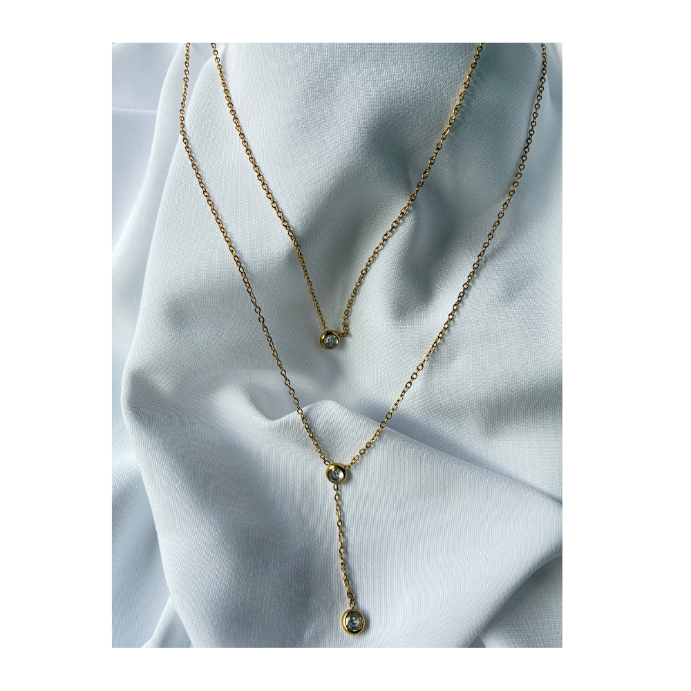 Un collier en Y finement doré, orné de zircon étincelant à son extrémité.
