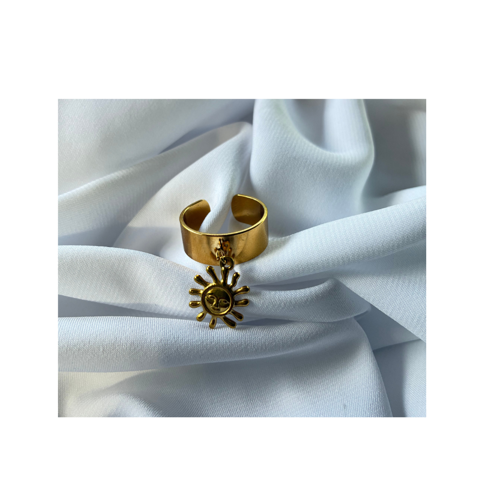 Une bague dorée ornée d’un pendentif soleil finement gravé. Légèrement mobile, elle attire les regards et réchauffe le cœur.