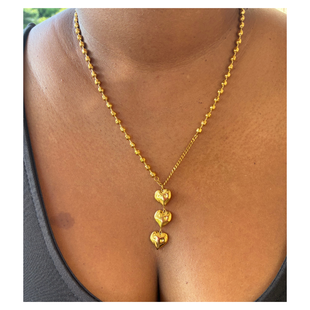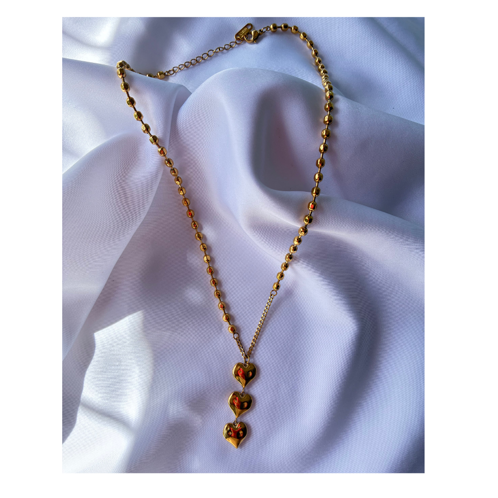 Le collier Aurelya met en lumière trois cœurs suspendus en délicate harmonie. Fin, romantique et lumineux.