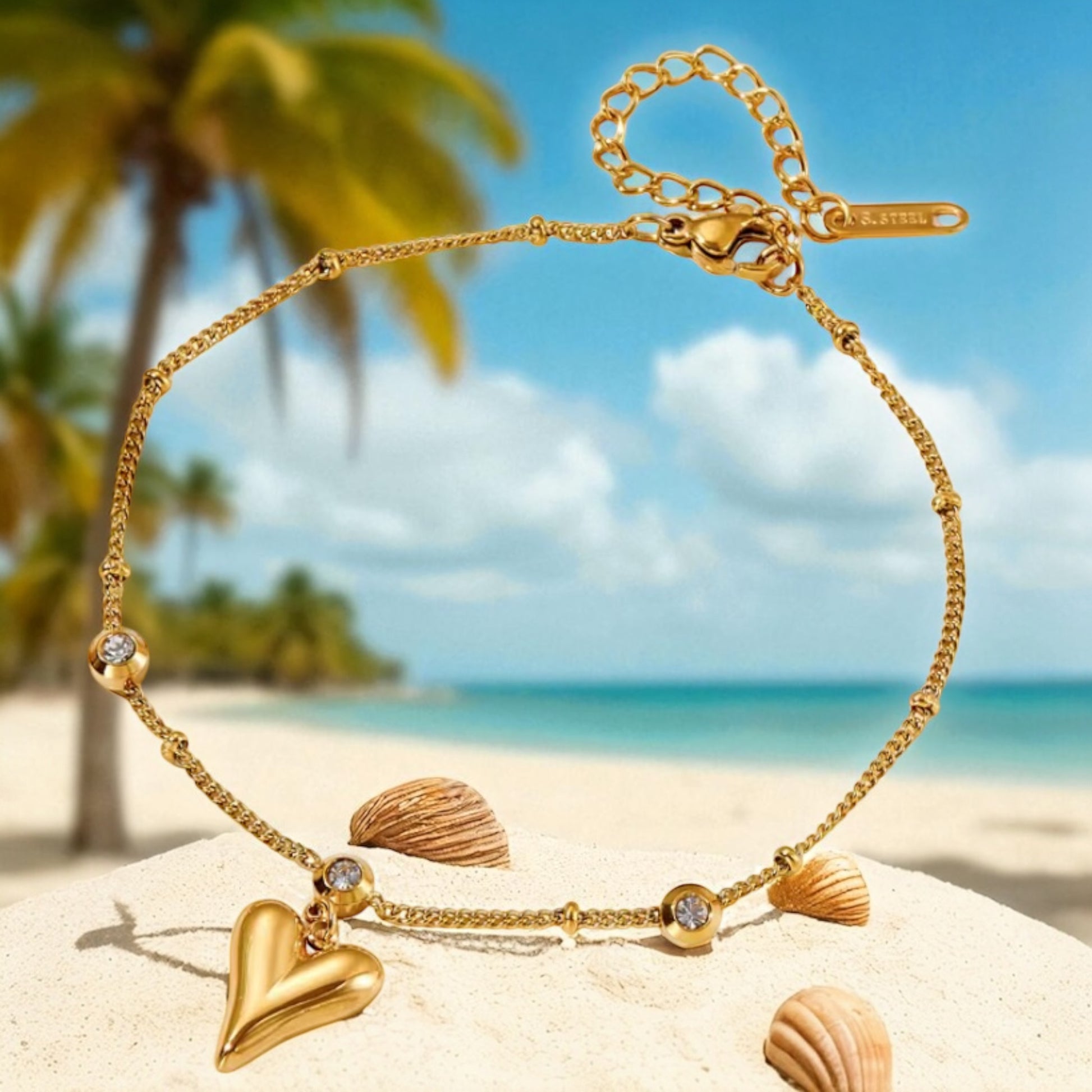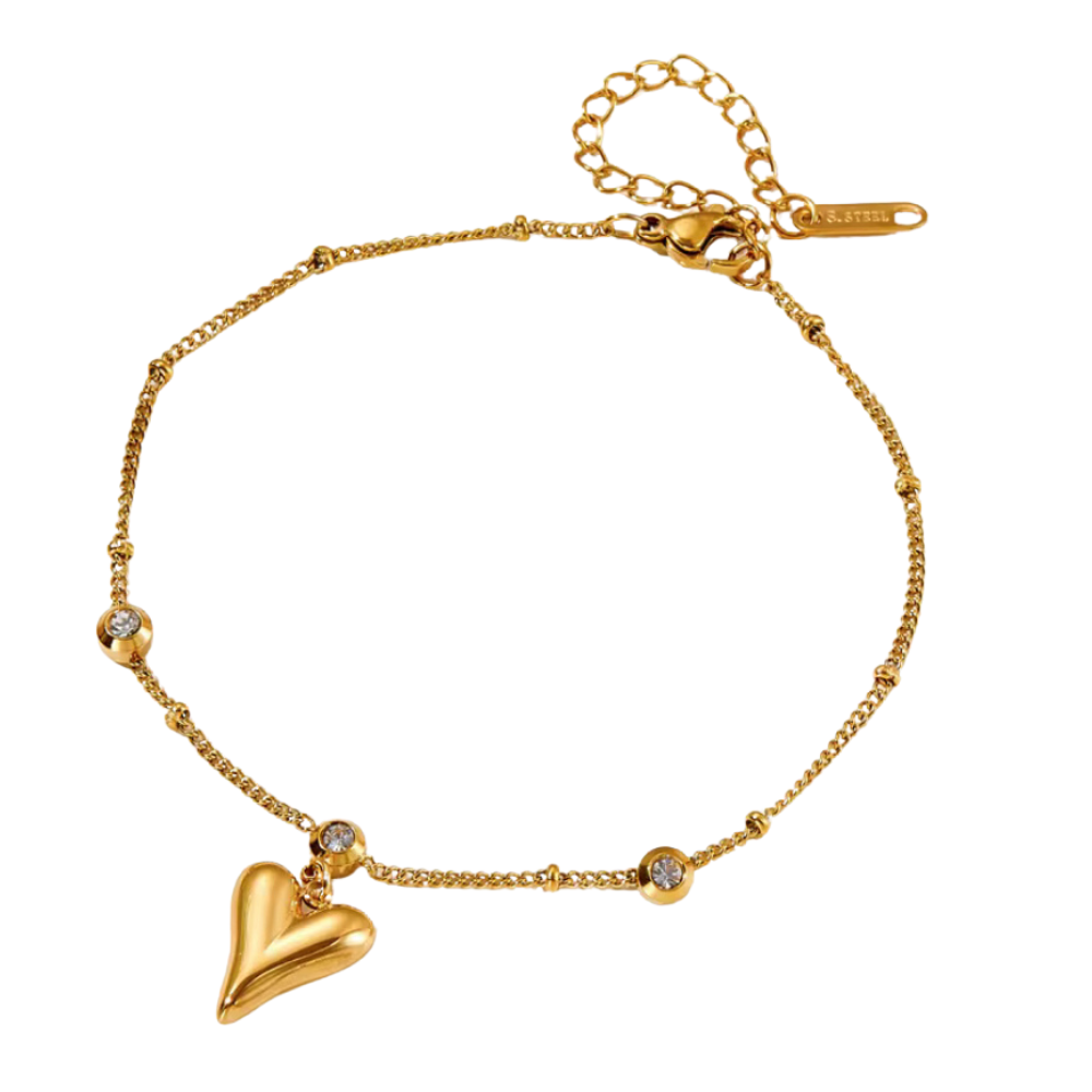 Sur cette chevillère délicate, un petit cœur suspendu s’accompagne de perles de zirconium qui illuminent subtilement la cheville.