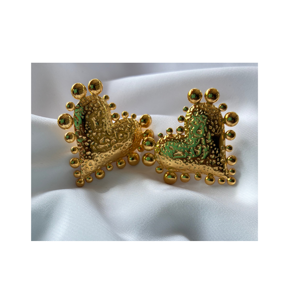Des boucles d’oreilles en forme de cœur au design texturé et parsemées de petites perles dorées.