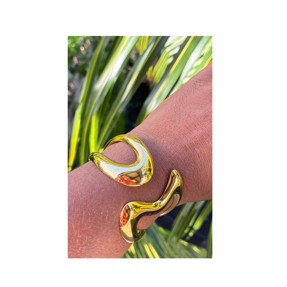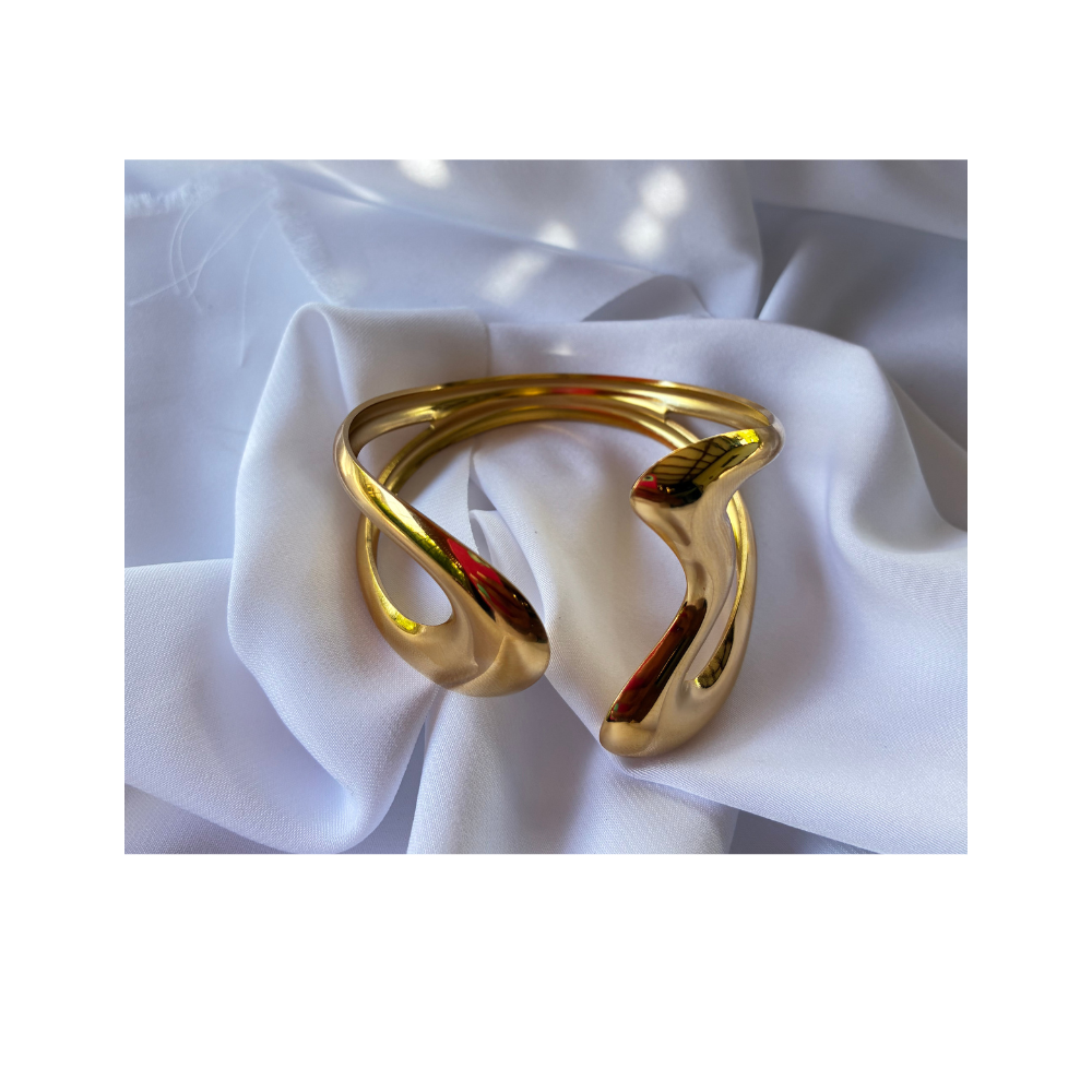 Bracelet style manchette au design irrégulier, avec un côté plus large et un côté plus petit pour un rendu moderne et unique.
