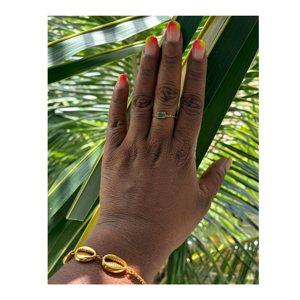 Une bague fine et délicate en forme de chaînette dorée, sublimée en son centre par un zircon vert éclatant.
