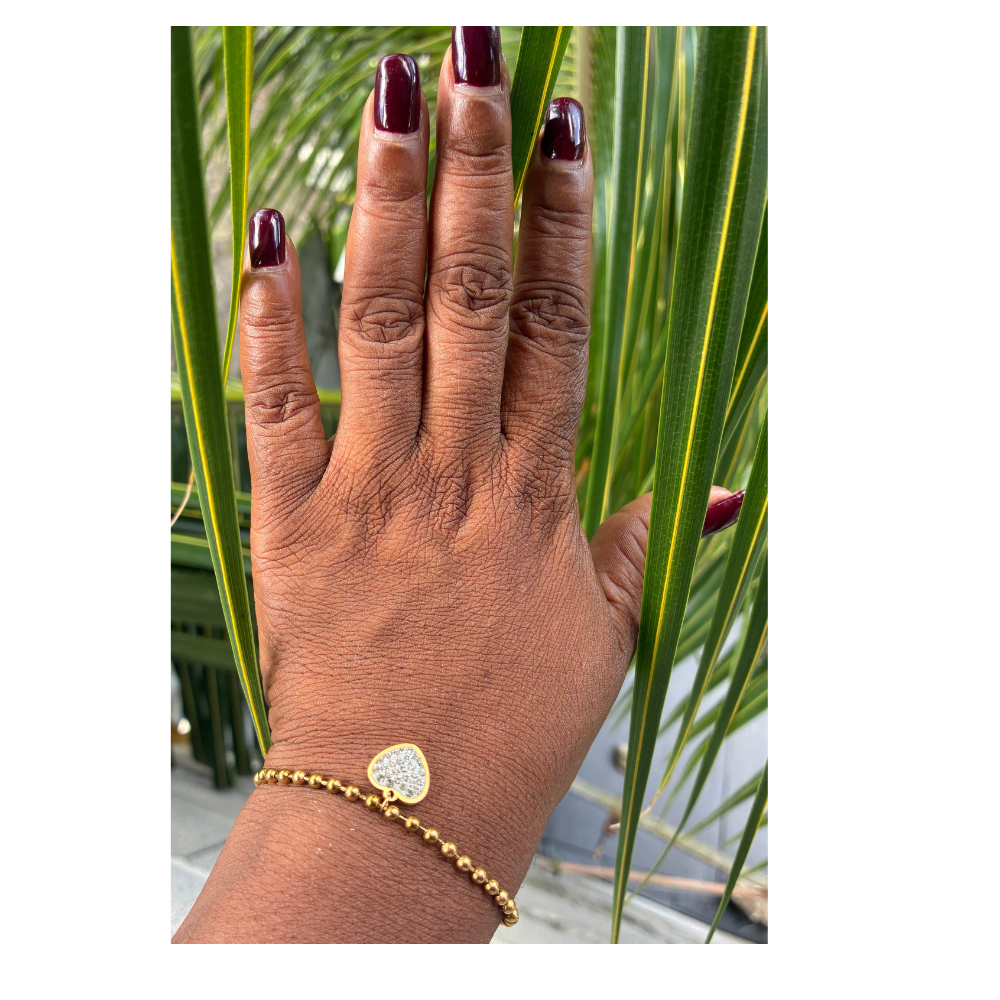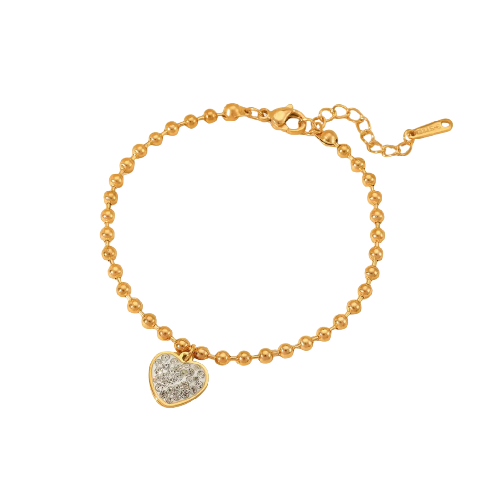 Un bracelet discret et féminin, orné d’une petite boule dorée et d’un pendentif cœur délicatement strassé.
