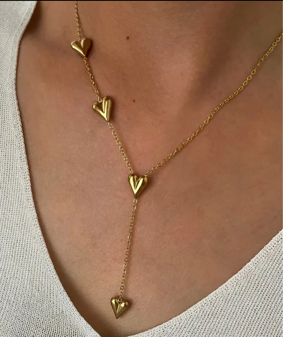 Un collier en Y doré orné de plusieurs petits cœurs le long de la chaîne, et d’un cœur central qui vient délicatement souligner le creux du buste.