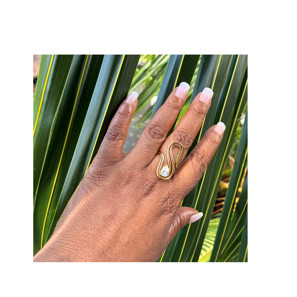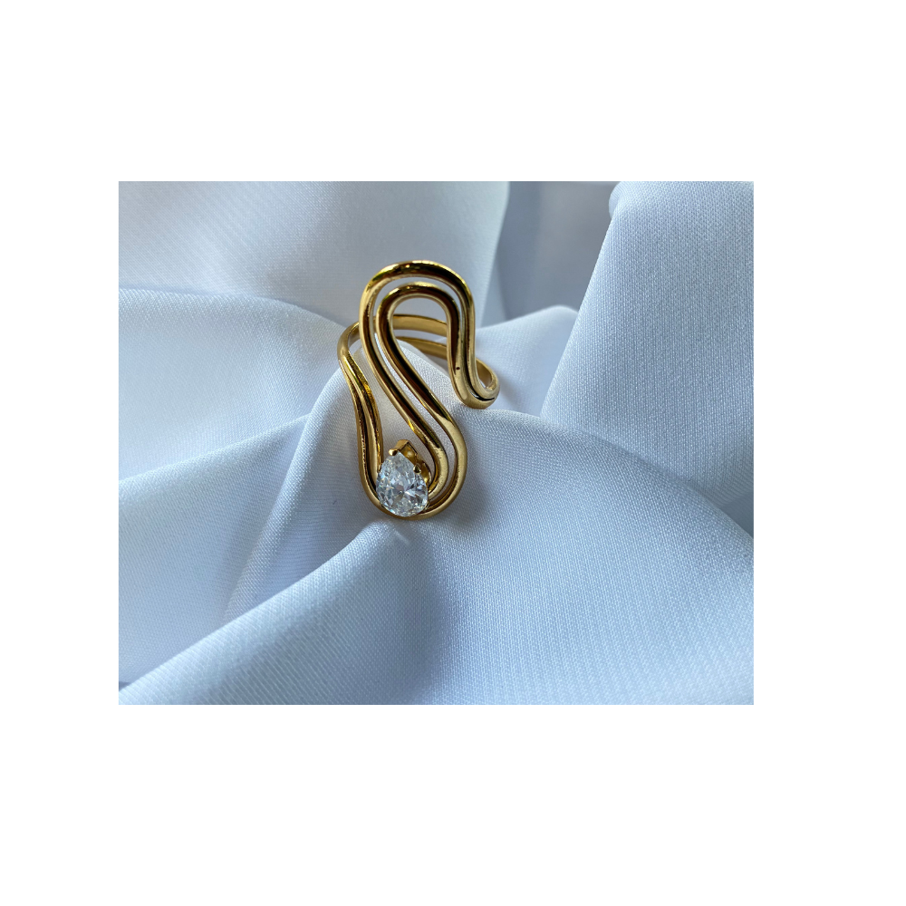 Bague dorée à forme irrégulière sertie d’un zircon scintillant , un design moderne et unique qui capte la lumière à chaque mouvement.