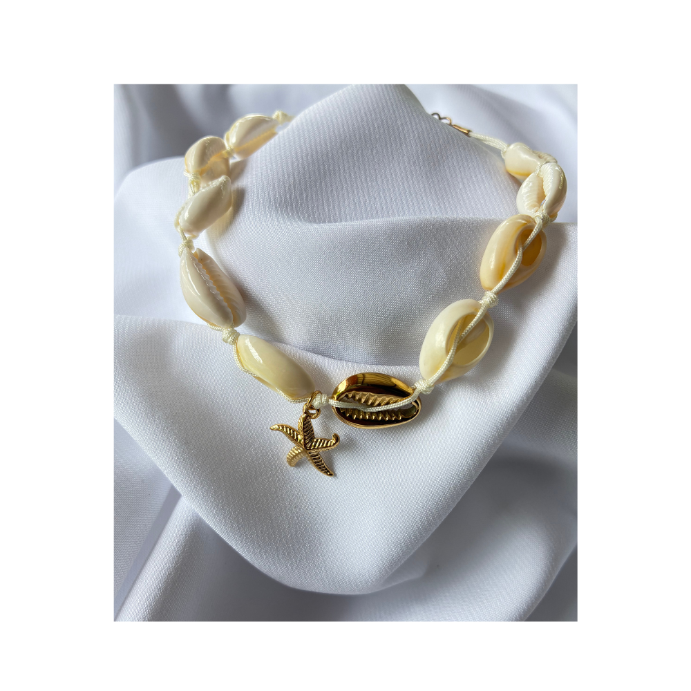 Une chaîne de cheville ornée de coquillage et dune coquillage et d’une étoile délicate en acier inoxydable.
