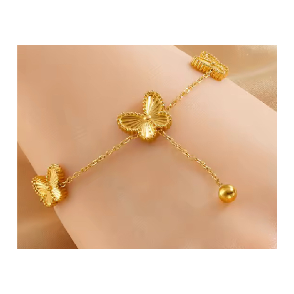 Un bracelet doré orné de jolis papillons délicats, terminé par une fine chaînette et sa petite perle dorée.