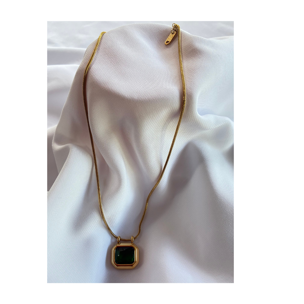 Collier Vérina, un bijou au charme rétro sublimé par son pendentif carré orné d’un zircon vert profond.